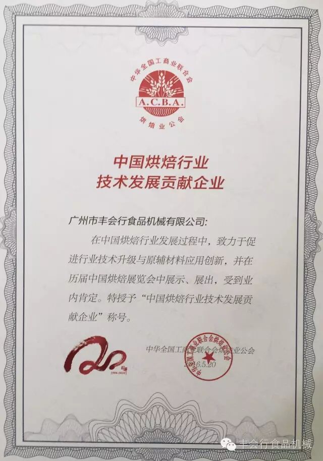 經過二十余年的沉淀,【豐會行】本著對食品機械的不斷創新,對產品質量的嚴格要求,對客戶的優質服務的經營理念,得到了《中華全國工商業聯合會烘焙業公會》的肯定,在本次展會中特授予【豐會行】為“中國烘焙行業技術發展貢獻企業”的榮譽。